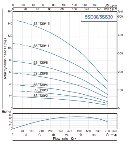 5SD deep well submersible pump is used to pump water from drilled deep wells, borehole wells, ponds, and lakes. Ideal for pressure boosters, firefighting systems, elevated and cistern tanks filling, water fountains, industrial and farming water supply, and agricultural irrigation